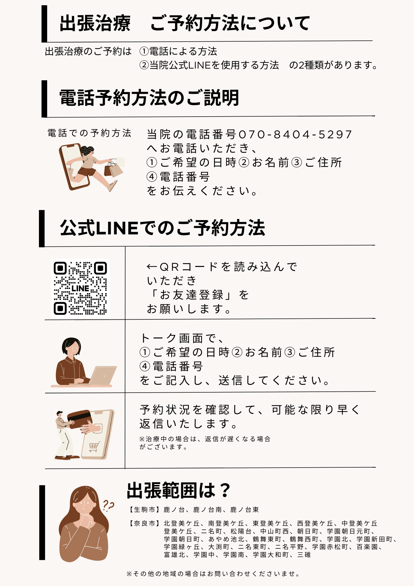 ※施術中の場合は電話に出ることができませんので、その際は留守番電話に「訪問鍼灸の予約である旨」のメッセージをいただければ、こちらからすぐに折り返しお電話させていただきます。